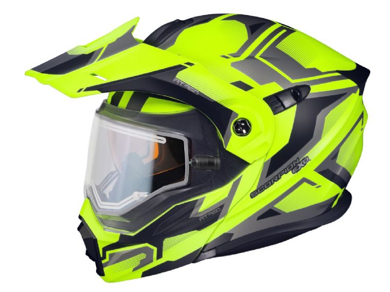 Introducing the EXO-AT950, a versatile modular adventure touring helmet. It has features and quality that you would expect to pay far more. The EXO-AT950 can be used as a full face adventure helmet with external peak visor attached, or the peak visor can be removed and you have an aerodynamic touring helmet. The no-fog Everclear® face shield can be removed and you can use the EXO-AT950 as a dirt helmet with goggles for off-road use. Our oversized eye port is extremely wide for greater peripheral vision and downward visibility, and the modular chin bar can be conveniently flipped up when you stop to get gas or ask for directions. The internal drop down sun visor and Kwikwick® II liner will keep you comfortable all day long even as lighting conditions change throughout the day. Three shell sizes made of advanced LG® polycarbonate and dual density eps, result in a helmet that is light weight, strong, and protective.