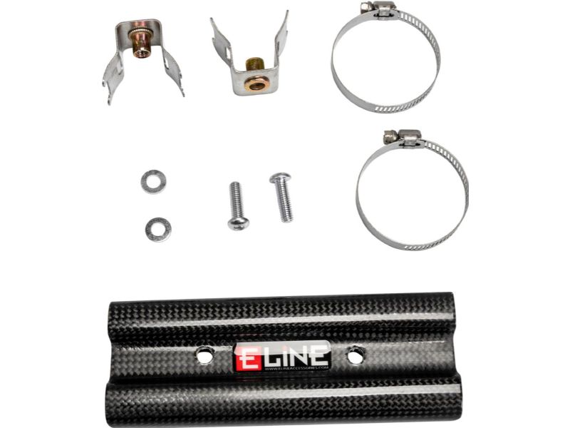 Whether you have an OEM or aftermarket exhaust system, the head pipe is susceptible to dings and dents as it gets hot so it is critical to protect it from potential impact damage. With temperatures exceeding 900-degrees Fahrenheit on most dirt bikes, your riding gear can be burnt quickly if it contacts an unprotected header, so before you sacrifice another pair of pants or boots, equip your bike with a carbon fiber exhaust heat shield and say goodbye to those burnt britches and boots. E Line Accessories dirt bike heat shields are designed to attach to the stock header bolt-on tabs so they are easy to install, but they do require a specific mounting kit that includes all the necessary hardware and instructions. Each kit features stainless steel mounting hardware that provides and exact fit that keeps the carbon heat shield the perfect distance away from the head pipe it is protecting. This type of attention to detail is part of what sets our components apart from the crowd.
