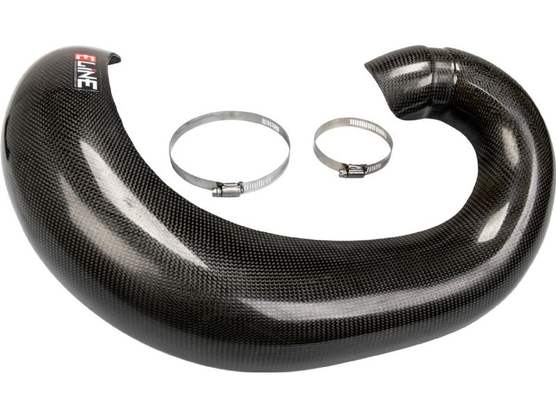 Our dirt bike exhaust pipe guards are manufactured using a hand laid mix of carbon, Kevlar and our unique high-temperature resistant resins. A total of 5 layers to be exact. This combination creates good looking, durable and clean fitting guards that will protect your expansion chamber from power-robbing dents and dings. Compared to other exhaust pipe guards, the E Line Accessories carbon fiber pipe guard is lighter and more durable with a 75-percent greater tensile strength from any of the metal units we have tested. It is “real carbon fiber.” Our carbon/Kevlar components are designed to be installed in a matter of minutes without removing the exhaust. A pair of stainless steel clamps are all that is needed to add durable, lightweight protection to the expansion chamber of your favorite motorcycle. Installation instructions are available on our web site videos.