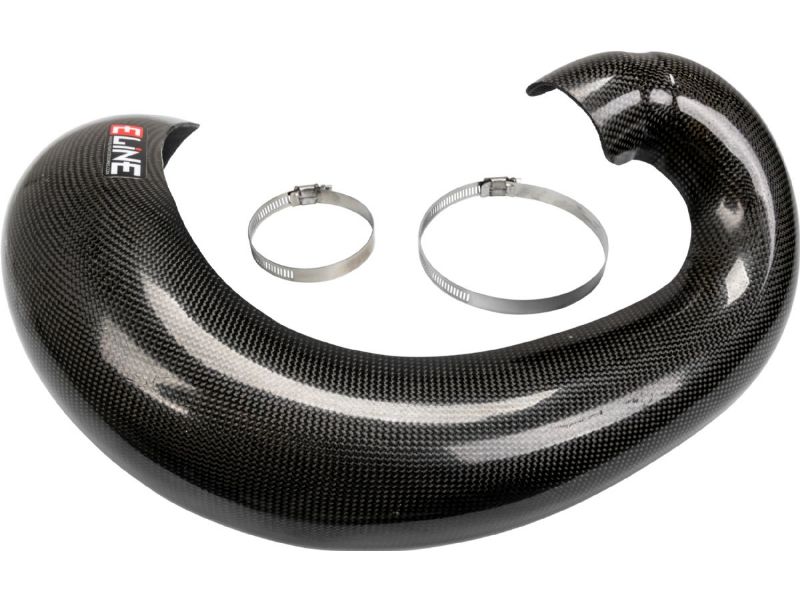 Our dirt bike exhaust pipe guards are manufactured using a hand laid mix of carbon, Kevlar and our unique high-temperature resistant resins. A total of 5 layers to be exact. This combination creates good looking, durable and clean fitting guards that will protect your expansion chamber from power-robbing dents and dings. Compared to other exhaust pipe guards, the E Line Accessories carbon fiber pipe guard is lighter and more durable with a 75-percent greater tensile strength from any of the metal units we have tested. It is “real carbon fiber.” Our carbon/Kevlar components are designed to be installed in a matter of minutes without removing the exhaust. A pair of stainless steel clamps are all that is needed to add durable, lightweight protection to the expansion chamber of your favorite motorcycle. Installation instructions are available on our web site videos.