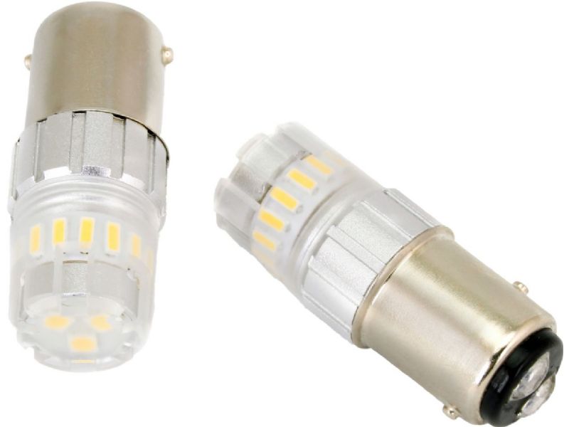 Ultra high power 6W LED automotive light bulb. Brighter than 21W standard bulbs. Omni directional design fills in the reflector housings. Standard fitting for almost all automotive and motorcycle applications using 1157 bulbs. Specifically designed to work in all Harley Davidson™ housings. Not DOT approved. Pricing is for a pair of bulbs.