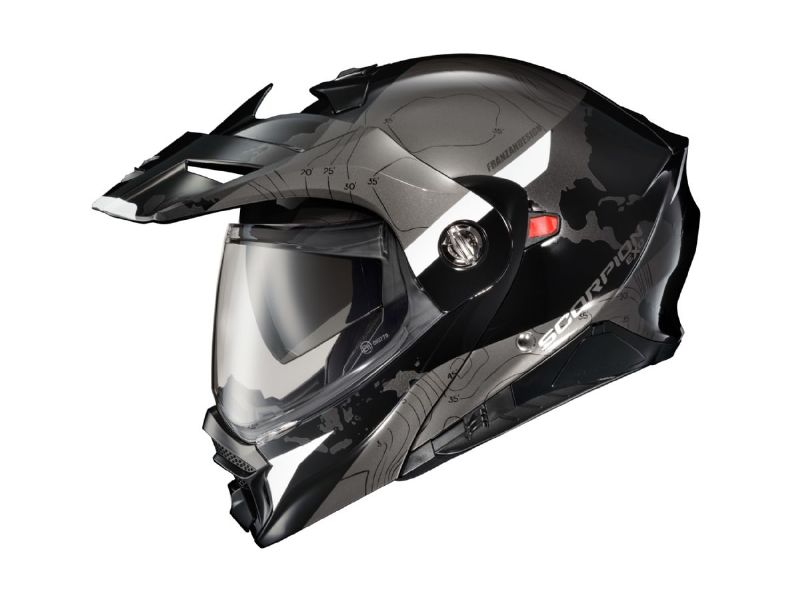 The EXO-AT960 Modular Helmet has evolved from one of the most popular Adventure Motorcycle helmets on the market; the EXO-AT950. Maintaining its high value (in addition to U.S. DOT Certification), ScorpionEXO has now added the latest ECE 22.06 Safety Rating, which requires a wider range of testing than the previous 22.05 certification. The EXO-AT960 can be used as a full face ADV helmet with external peak visor attached, or the peak visor can be removed for a more aerodynamic touring helmet. The oversized eye port is extremely wide for greater peripheral vision and downward visibility, and the modular chin bar can be conveniently flipped up. The internal drop down Speedview® sun-visor allows you to adjust to changing lighting conditions throughout the day. Additionally, the no-fog Everclear® face shield can be removed and you can use the EXO- AT960 with goggles for off-road use. Three shell sizes made of Advanced LG® Polycarbonate and dual density EPS, result in a helmet that is light weight, strong, and protective. And for those who need to stay connected, the EXO-AT960 was specifically designed to integrate with the new EXO-COM® BlueTooth® Communicator Kit while the large speaker pockets also make it compatible with many other com systems in the market.