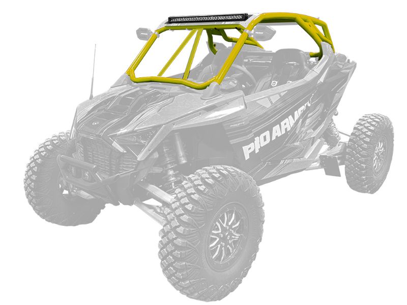 RZR Turbo R Cage System available with V or no intrusion bar. This cage completely changes the lines of your Polaris RZR Turbo R. Made of 1.75" & 2" DOM steel tubing and MIG welded. Easy install with no drilling necessary and comes with all necessary hardware. We also offer a matching aluminum roof with or without a light pocket.