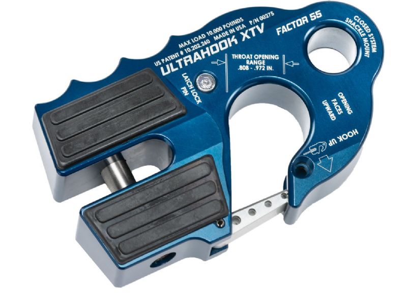 The world’s safest UTV/ATV winch hook. Featuring Industry first Closed System Shackle Mount hole machined into the body of the hook, safety latch retraction pocket resulting in a clear throat opening, integrated secondary safety latch locking feature-latch locking pin stored in the body of the UltraHook XTV which can be removed and inserted in to the hook tip, locking the latch into place. EPDM rubber pads for fairlead protection, titanium double shear pin, and a finger grip feature that promotes proper “Hook Up” orientation. The first winch hook that can be stored against your fairlead protecting either your hawse or roller style fairlead from a metal to metal connection.