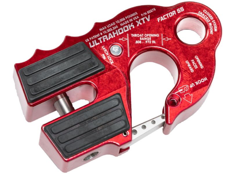 The world’s safest UTV/ATV winch hook. Featuring Industry first Closed System Shackle Mount hole machined into the body of the hook, safety latch retraction pocket resulting in a clear throat opening, integrated secondary safety latch locking feature-latch locking pin stored in the body of the UltraHook XTV which can be removed and inserted in to the hook tip, locking the latch into place. EPDM rubber pads for fairlead protection, titanium double shear pin, and a finger grip feature that promotes proper “Hook Up” orientation. The first winch hook that can be stored against your fairlead protecting either your hawse or roller style fairlead from a metal to metal connection.