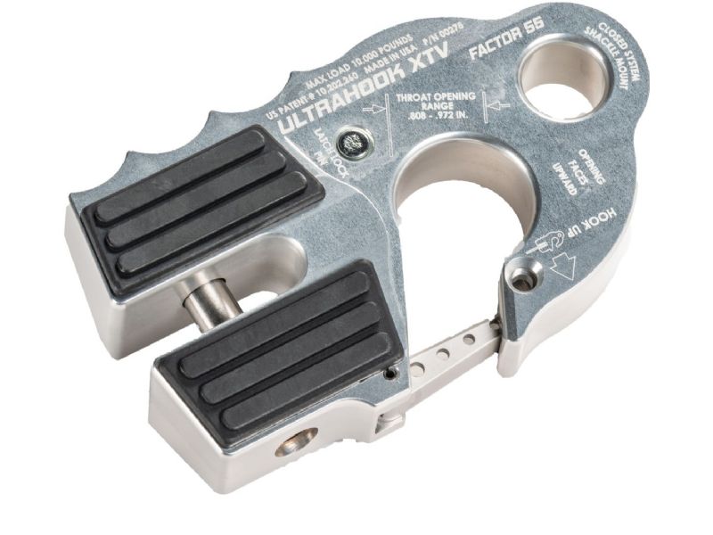 The world’s safest UTV/ATV winch hook. Featuring Industry first Closed System Shackle Mount hole machined into the body of the hook, safety latch retraction pocket resulting in a clear throat opening, integrated secondary safety latch locking feature-latch locking pin stored in the body of the UltraHook XTV which can be removed and inserted in to the hook tip, locking the latch into place. EPDM rubber pads for fairlead protection, titanium double shear pin, and a finger grip feature that promotes proper “Hook Up” orientation. The first winch hook that can be stored against your fairlead protecting either your hawse or roller style fairlead from a metal to metal connection.
