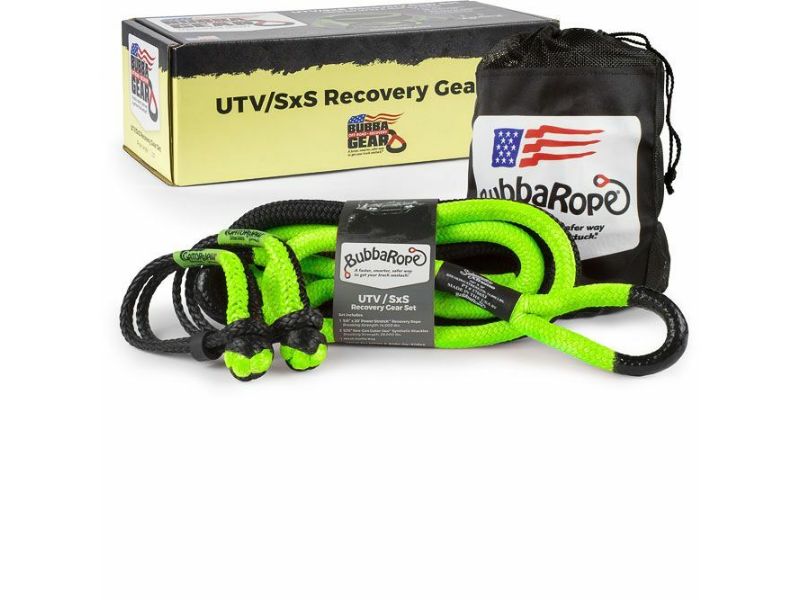Includes Bubba Rope’s Sidewinder 5/8" diameter Power Stretch® Recovery Rope and matching NexGen Gator-Jaw® synthetic soft shackles. The Power Stretch Rope with vinyl armor Gator-ized coatings comes in a 20' length. The set also includes a heavy-duty mesh duffle gear bag for easy carrying and storing. With multiple color options this is the gear set that started it all, setting the bar for dynamic off-road recovery gear. Copied but never duplicated, Bubba’s Off-Road Recovery Gear is 100% made in the USA with unmatched hand-made quality. With a certified breaking strength of 14,000 lbs., the gear set is ideal for vehicles weighing 1,000 – 3,000 lbs. Everything you need for a faster, smarter, safer way to get your UTV unstuck.