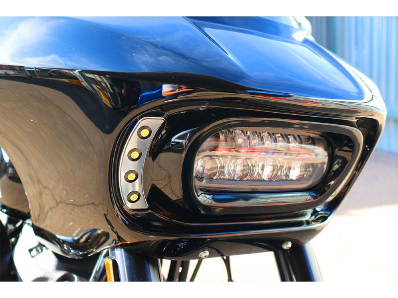 These slick plates fit perfectly on the sides of the Sharknado® Fairing. However, it’s your bike, do what you think is cool. Use one set of these crescent-shaped mounting plates, OR be creative and combine them for a truly out-of-this-world light array! Each plate is C.N.C. machined from 6061-T6 Aluminum for strength & durability and is available in black or a polished finish. Included with your Quad-Pod plates are four sets of Day Time Running Lightning Bolts with C.O.B. “switchback” signal technology. Chip On Board Technology (C.O.B.) is a method of circuit board manufacturing in which the integrated circuits are wired, bonded directly to a printed circuit board, and covered by epoxy. These C.O.B. lights are more compact, lighter, less costly, and most importantly… BRIGHTER than a regular LED!