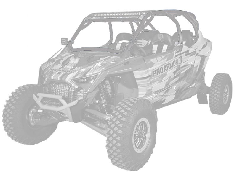 RZR Pro R Cage System available with V or no intrusion bar. This cage completely changes the lines of your Polaris RZR Pro R Made of 1.75" & 2" DOM steel tubing and MIG welded. Easy install with no drilling necessary and comes with all necessary hardware. We also offer a matching aluminum roof with or without a light pocket.