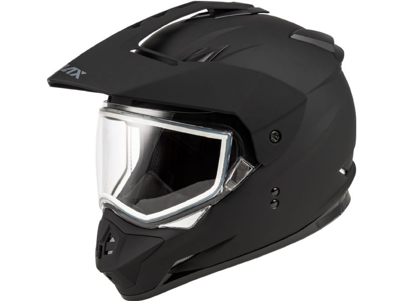 - Helmet includes clear dual lens shield, cold weather breath box and chin curtain