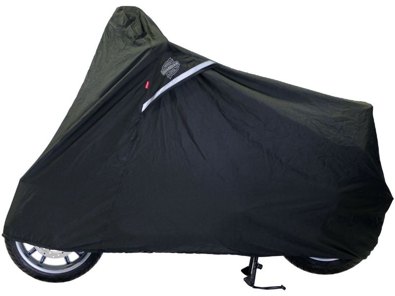 Stays secure: elastic shock cord is sewn into the bottom hem of the cover to provide a snug fit, and a polyester webbing belly strap is sewn in to prevent the motorcycle cover from coming off in high winds