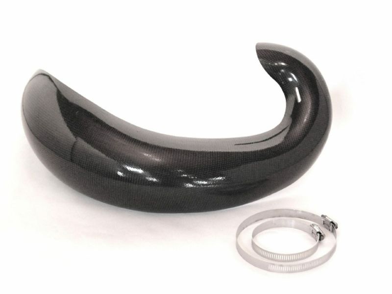 Our dirt bike exhaust pipe guards are manufactured using a hand laid mix of carbon, Kevlar and our unique high-temperature resistant resins. A total of 5 layers to be exact. This combination creates good looking, durable and clean fitting guards that will protect your expansion chamber from power-robbing dents and dings. Compared to other exhaust pipe guards, the E Line Accessories carbon fiber pipe guard is lighter and more durable with a 75-percent greater tensile strength from any of the metal units we have tested. It is “real carbon fiber.” Our carbon/Kevlar components are designed to be installed in a matter of minutes without removing the exhaust. A pair of stainless steel clamps are all that is needed to add durable, lightweight protection to the expansion chamber of your favorite motorcycle. Installation instructions are available on our web site videos.