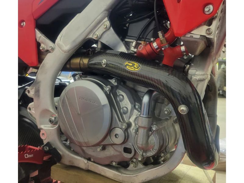 P3 Carbon Fiber Composite 4-Stroke Head Pipe Guard/Heat Shields are a must for any 4-Stroke rider. This product serves three purposes. 1) The Heat Shield keeps your expensive riding pants and boots protected from super heated exhaust pipes. 2) The Pipe Guard protects your sensitive head pipe from unwanted dents and dings. 3) P3's polished carbon product and colorful logo gives your off-road machine a full factory racing look!