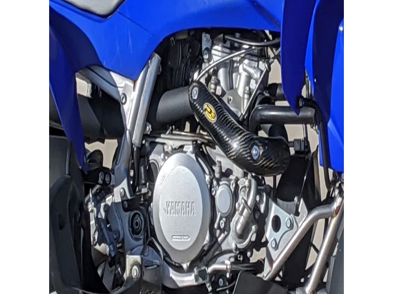 P3 Carbon Fiber Composite 4-Stroke Head Pipe Guard/Heat Shields are a must for any 4-Stroke rider. This product serves three purposes. 1) The Heat Shield keeps your expensive riding pants and boots protected from super heated exhaust pipes. 2) The Pipe Guard protects your sensitive head pipe from unwanted dents and dings. 3) P3's polished carbon product and colorful logo gives your off-road machine a full factory racing look!