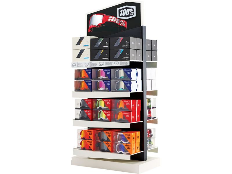 Modular display tower is a two-sided floor standing unit designed to merchandise Goggles, Gloves, Helmets, and Protection