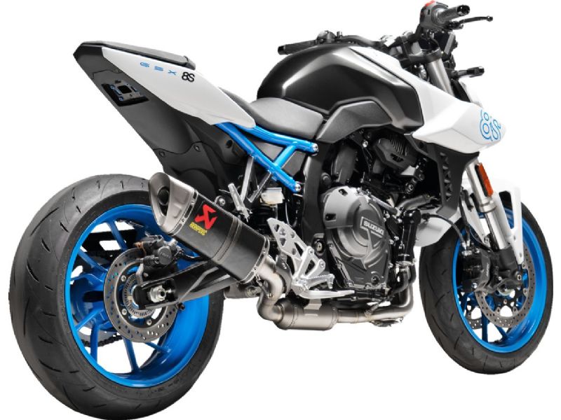 A carbon-fiber muffler outer sleeve, heatshield, and clamp, a titanium end cap, stainless-steel header, resonator, and link pipe, and a black-coated aluminum muffler bracket create a weight saving of 39.6% (3.2 kg) over the stock exhaust