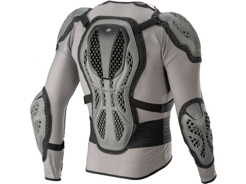 Back protector features three articulated plates to allow for greater flexibility and adaptive back fit in all riding positions