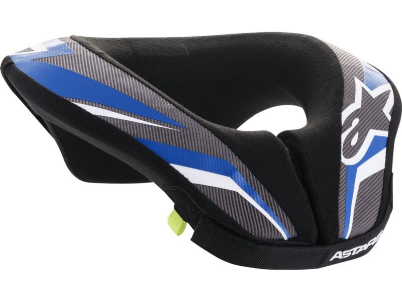 Hybrid children-™s neck protection with extended tail for position stability. Double density core is made from a soft PU foam base embedded in a hard EVA layer for energy dissipation.