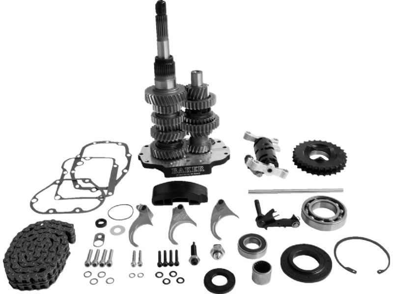 1. Includes a trap door, 6-speed gear set (3.24:1 1st gear/.86:1 6th gear), 28-tooth motor sprocket, longer primary chain, adjusting shoe, fixed spindle-shift drum and anti-overshift ratchet shift pawl assembly