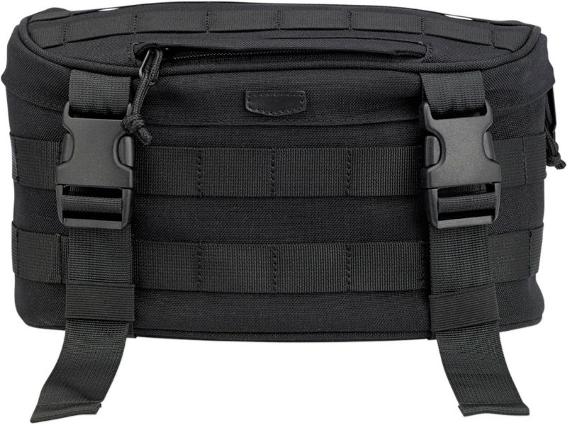 One-inch-wide nylon modified MOLLE system on perimeter panels and back for strap placement; includes four reinforced leather straps with nickel-plated buckles