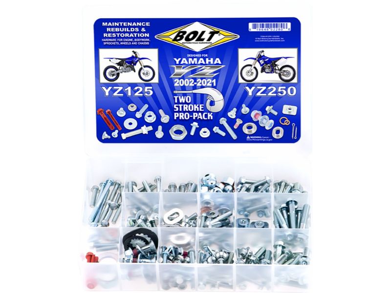 Kit contains OEM-style hardware in factory style and finish including: factory-style bushing for the bodywork, shroud bolts, seat bolts, sub-frame bolts, fork guard bolts, rotor bolts, a full set of sprocket bolts, T-nuts, rim lock spacers, valve stem grommets and caps, chain adjuster screws, Fuji lock nuts, pan head screws, M8 and M6 flange bolts and drain plug washers