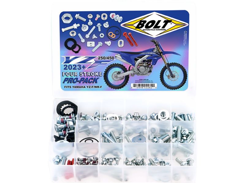 Kit contains OEM-style hardware in factory style and finish including: factory-style bushing for the bodywork, shroud bolts, seat bolts, sub-frame bolts, fork guard bolts, rotor bolts, a full set of sprocket bolts, T-nuts, rim lock spacers, valve stem grommets and caps, chain adjuster screws, Fuji lock nuts, pan head screws, M8 and M6 flange bolts and drain plug washers