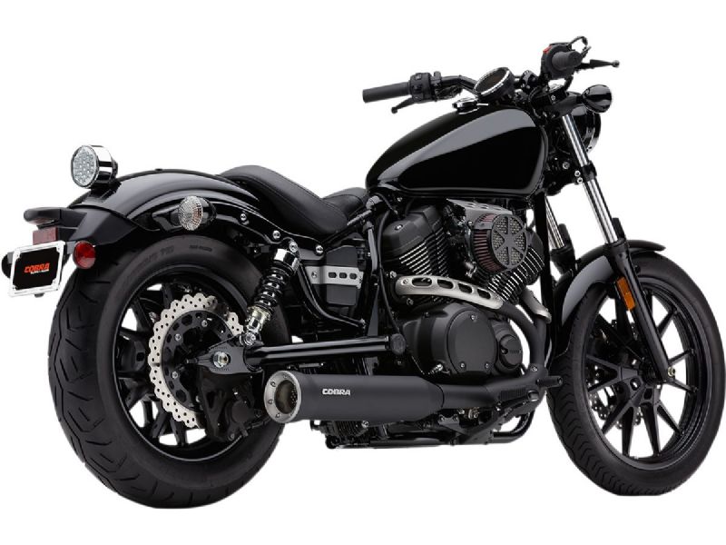 Satin black muffler includes a custom heat shield to smooth transition from stock headpipes to Cobra muffler