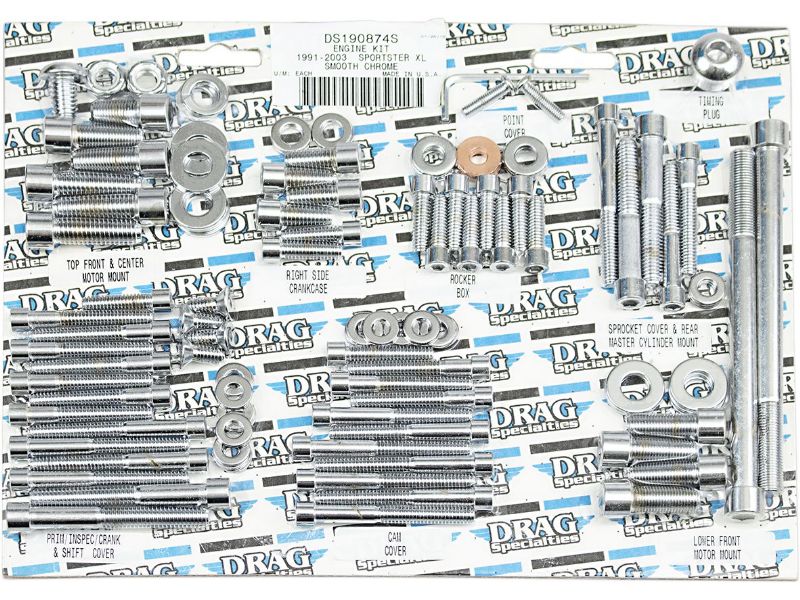 Complete motor sets for 87-94 Big Twin include bolts for cam, primary, point, clutch, inspection and chain covers, lifter base, inner primary, top front and rear motor mounts, timing plug and header mount screws