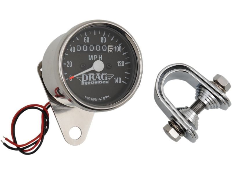 - Mechanically driven speedometers, with chrome body and polished stainless bezel, feature chromed custom steel mounts with handlebar clamps