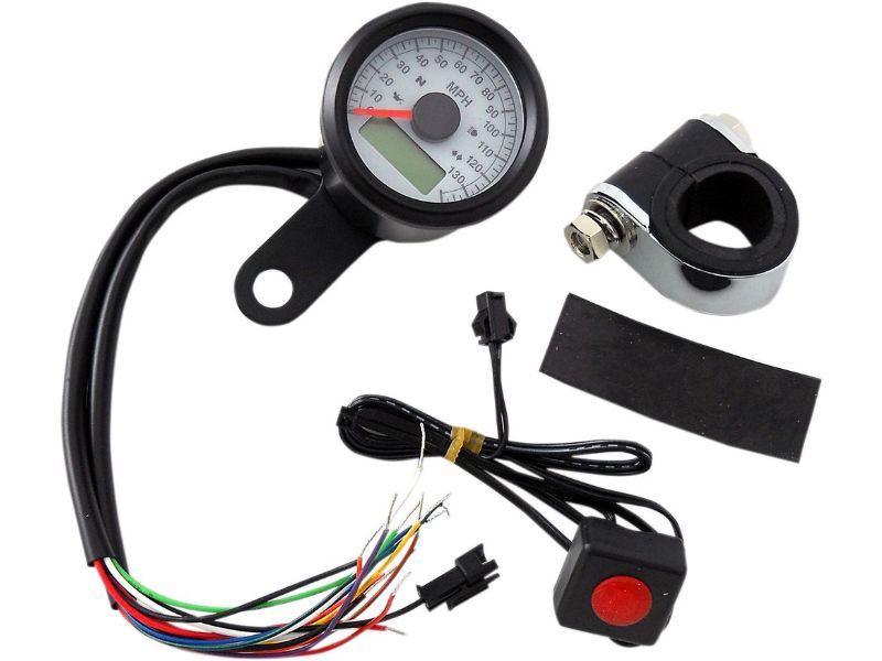 Programmable Speedometer with Indicator Lights - Gloss Black - 140 MPH LED White Face - 1-7/8-