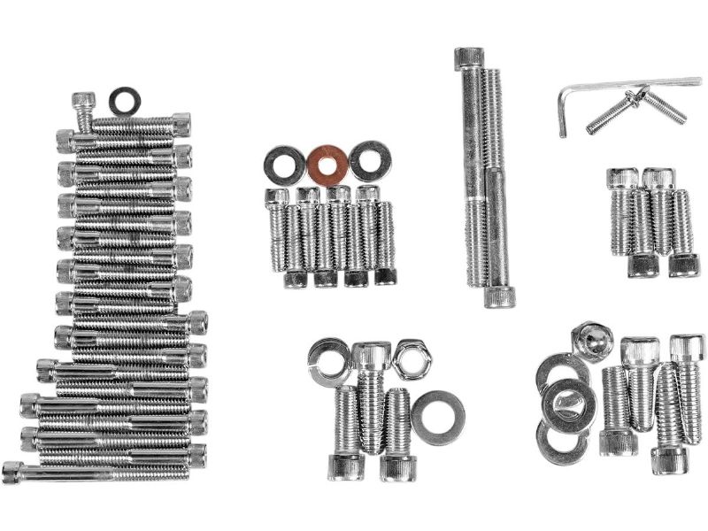 Complete motor sets for 87-94 Big Twin include bolts for cam, primary, point, clutch, inspection and chain covers, lifter base, inner primary, top front and rear motor mounts, timing plug and header mount screws