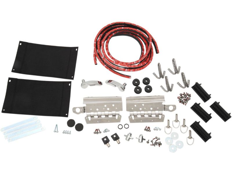 Kit includes lid hinges, lid gaskets, tethers, latch handles with seals, latch strikes, saddlebag bailhead studs, rubber isolators, washers, chrome lock set with keys and cushions