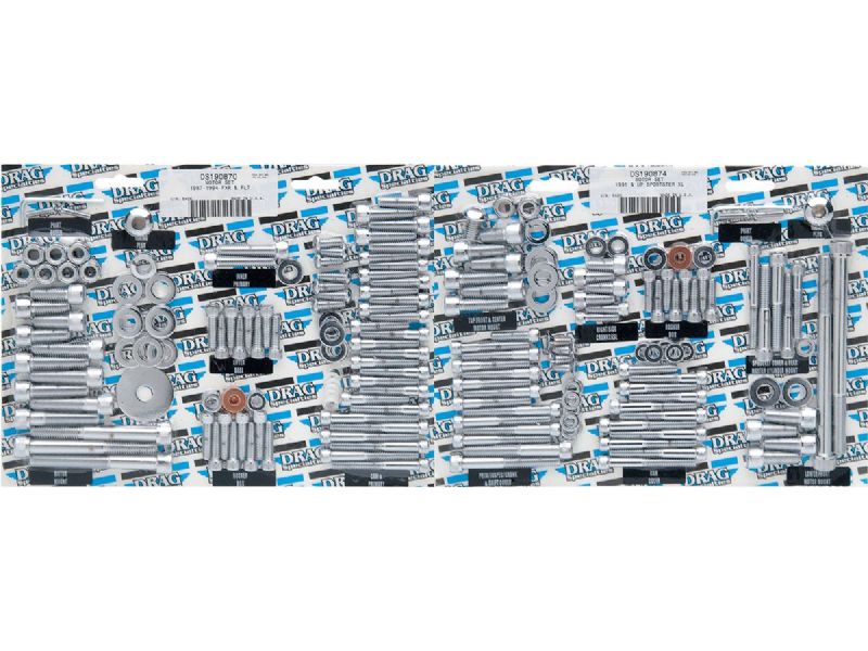 Complete motor sets for 87-94 Big Twin include bolts for cam, primary, point, clutch, inspection and chain covers, lifter base, inner primary, top front and rear motor mounts, timing plug and header mount screws