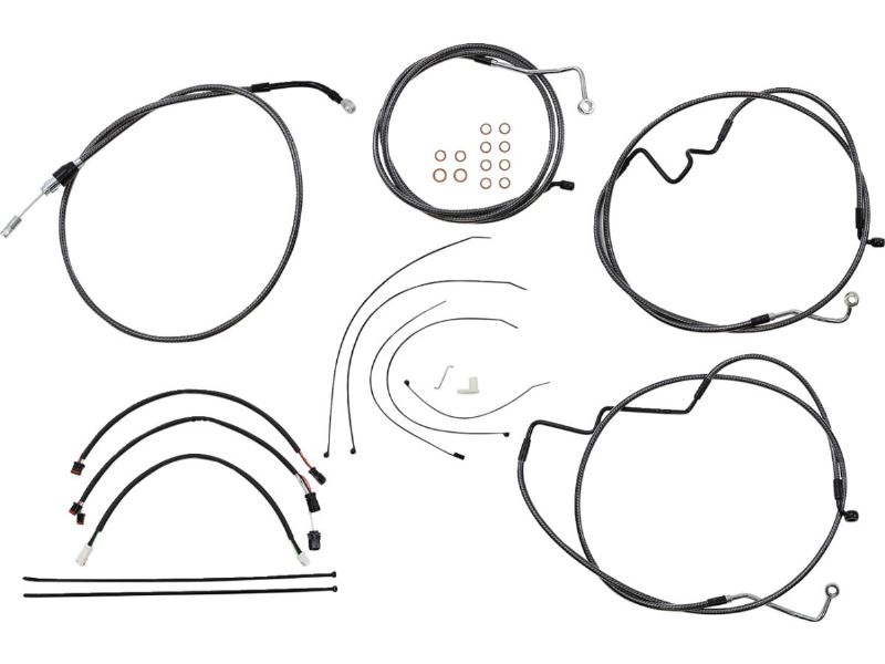 2. Kit includes premium brake lines, clutch cable or hydraulic clutch line, throttle and idle cables or throttle-by-wire extensions, hardware, and fully terminated or plug-and-play switch and turn signal extensions
