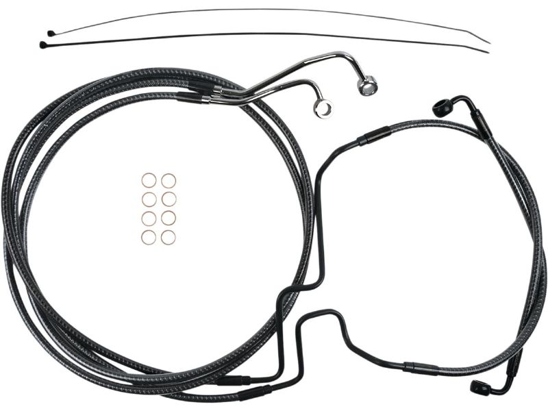 Brake line kit consists of a direct fit lower assembly used in conjunction with alternative length upper lines