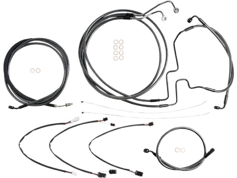 2. Kit includes premium brake lines, clutch cable or hydraulic clutch line, throttle and idle cables or throttle-by-wire extensions, hardware, and fully terminated or plug-and-play switch and turn signal extensions