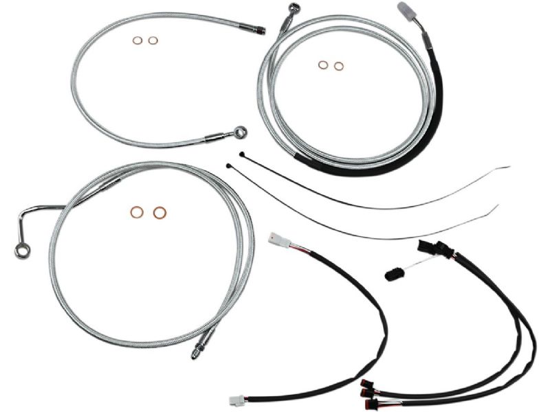 Kit includes throttle and idle cables of throttle-by-wire extensions, clutch cable or hydraulic clutch line, brake lines, copper crush washers, hardware, and any necessary switch wiring of turn signal extension