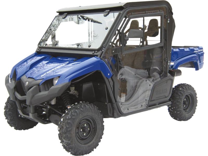 2. Front windshields are made of laminated tempered safety glass; two-position tilt-out function is gas cylinder assisted; wiper and washer kit sold separately; window is attached to the overhead guard with a metal clamping system and locks in two positions for air intake