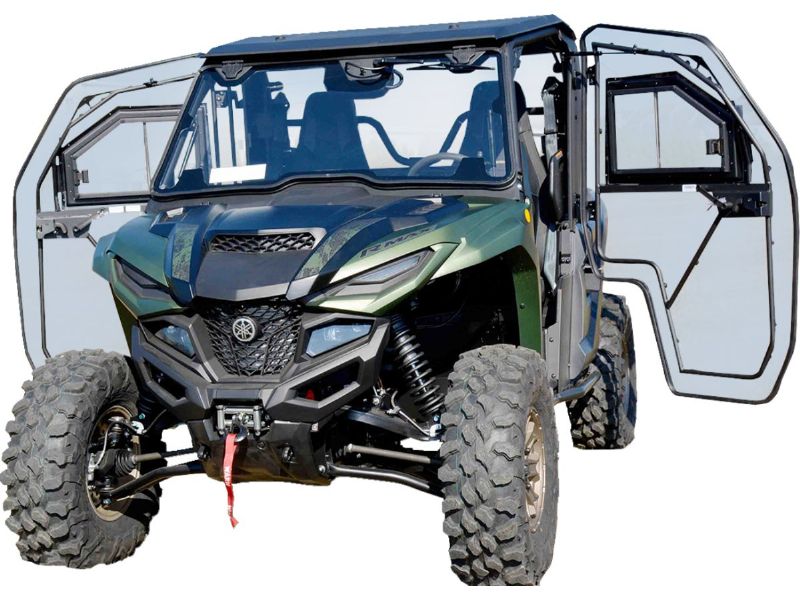 2. Front windshields are made of laminated tempered safety glass; two-position tilt-out function is gas cylinder assisted; wiper and washer kit sold separately; window is attached to the overhead guard with a metal clamping system and locks in two positions for air intake