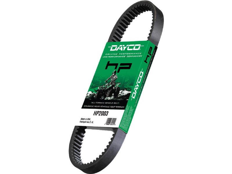 Off the road or off the tee this DAYCO HP ATV belt delivers the long, smooth, dependable drives that you have learned to expect from power transmission belts that carry the DAYCO brand. Manufactured from aramid reinforced polychloroprene and P-aramid cord to ensure Dayco's HP belts's superior strength, enhanced dimensional integrity and longer belt life.