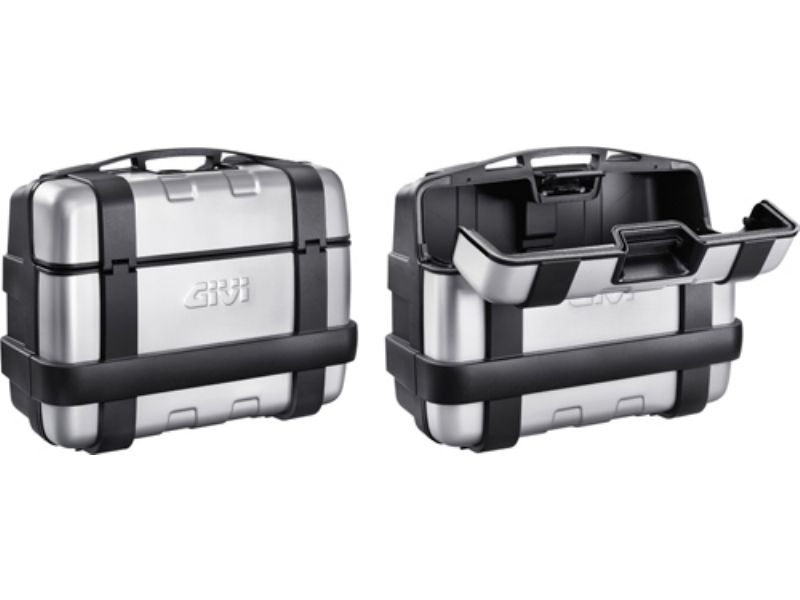 GIVI has ventured into the adventure touring market with the new Trekker series. These aluminum/polypropylene cases utilize the patented GIVI MONOKEY® system giving a lockable, waterproof and easily removable case option. The 33 and 46 liter GIVI TREKKER series are their newest adventure touring cases utilizing a unique full and partial lid opening system. The spacious 52 liter top case does not sport the dual opening system but does allow the storage for two modular helmets where the other sizes do not. Made from a combination of polypropylene and aluminum panels, the TREKKER series with its patented MONOKEY® latching system now offer the convenience of GIVI hard cases in a more rugged style for the adventure touring motorcycle rider.