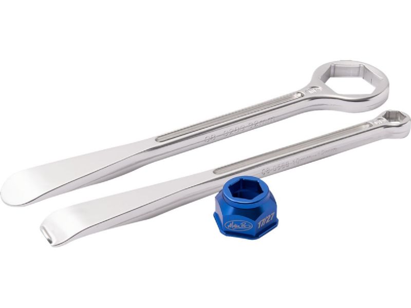 - Second wrench has hex box wrench for 32 mm axle nuts on other end