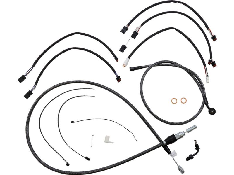 2. Kit includes premium brake lines, clutch cable or hydraulic clutch line, throttle and idle cables or throttle-by-wire extensions, hardware, and fully terminated or plug-and-play switch and turn signal extensions