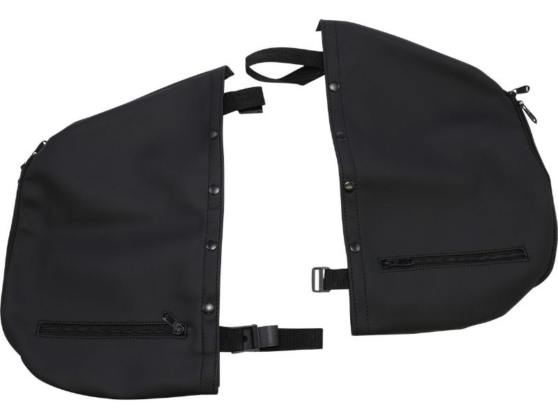 Snaps on the engine guards in seconds with adjustable nylon webbing lanyard straps and a perimeter steel zipper that sets the opening where you need it for your highway pegs