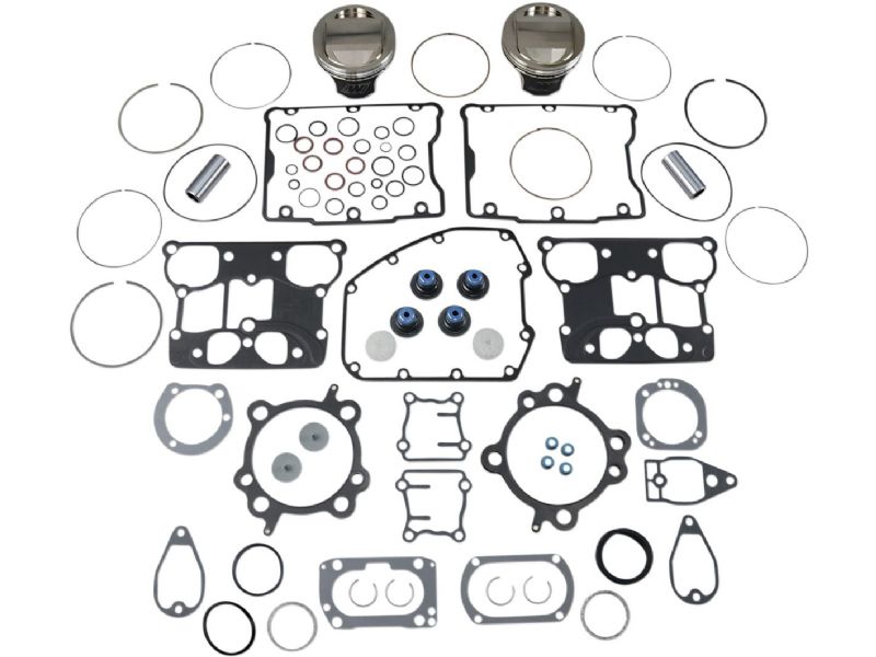 - Kit includes pistons, retainer clips, chrome piston pins, top end gasket kit, and VM-Rings package (1.2 mm steel, positive twist, gas nitrided top ring, 1.2 mm cast iron, taper under-hook scraper ring and 2.0 mm three piece, flex vent oil ring with steel chrome-faced rails); VMF- Ring package includes 3.0 mm oil ring instead of 2.0 mm oil ring