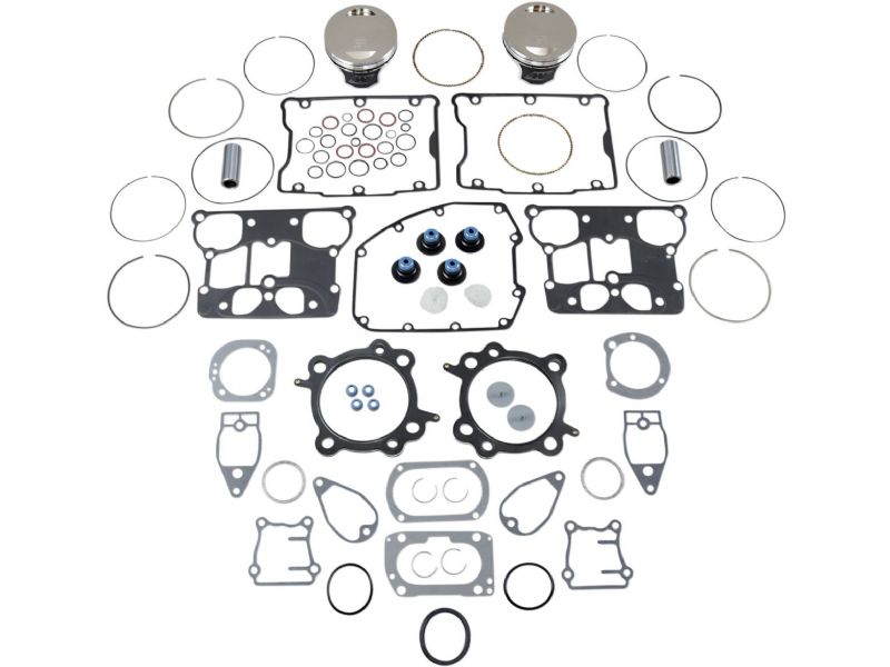- Kit includes pistons, retainer clips, chrome piston pins, top end gasket kit, and VM-Rings package (1.2 mm steel, positive twist, gas nitrided top ring, 1.2 mm cast iron, taper under-hook scraper ring and 2.0 mm three piece, flex vent oil ring with steel chrome-faced rails); VMF- Ring package includes 3.0 mm oil ring instead of 2.0 mm oil ring