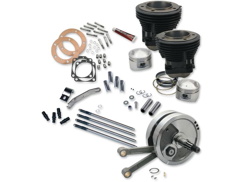 Includes 3.625- bore high tensile, cast iron sidewinder cylinders and forged pistons with wrist pin and rings, a 4.5- or 4.625- stroke, dynamically balanced S&S flywheel assembly complete with S&S heavy duty connecting rods and mainshafts, S&S stainless steel head bolts, base nut, S&S adjustable chromoly steel pushrods, head gaskets, base gaskets, exhaust gaskets, and an S&S heavy-duty top motor mount