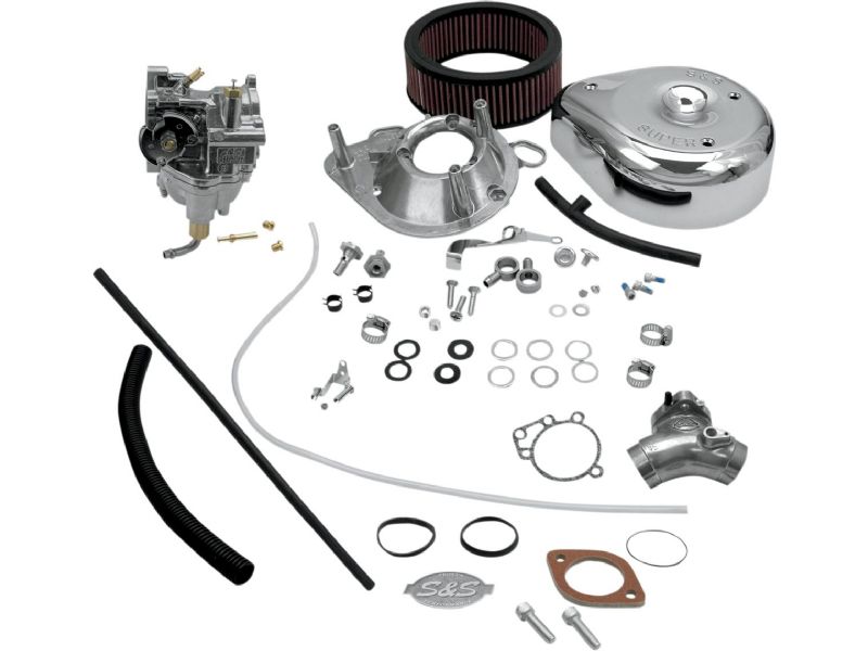 1. Carb kit includes a carburetor with updated fuel delivery pots and idle screws, teardrop air cleaner assembly, manifold, mounting hardware, fuel line, clamps, overflow line, one extra intermediate jet and two main jets, VOES tubing (when applicable), installation and jetting instructions