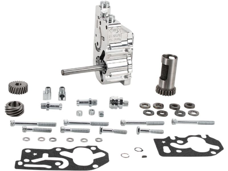 5. Kit includes supply gears, return gears, drive shaft, drive shaft keys, drive shaft snap rings, check ball, check ball spring, pressure valve spring, cover screws with O-rings, miscellaneous hose fittings, plugs, screws, gaskets, mounting hardware, oil pump drive shaft gear, oil pump pinion shaft gear, S&S breather gear and shim kit and instructions