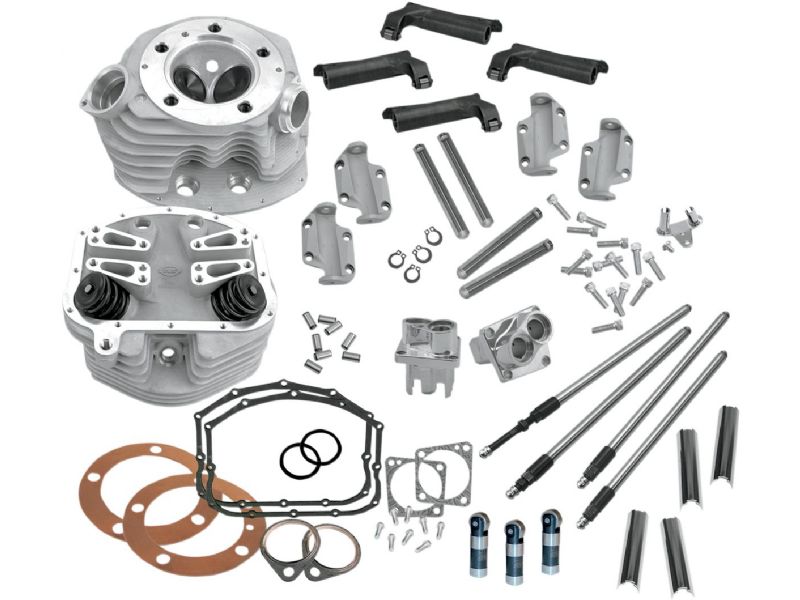 Kit consists of a set of S&S P-series cylinder heads with rocker cradles, S&S roller rocker arms, S&S hydraulic tappets, billet tappet guides, Quickee pushrods, pushrod cover clips and all required gaskets and hardware for assembly